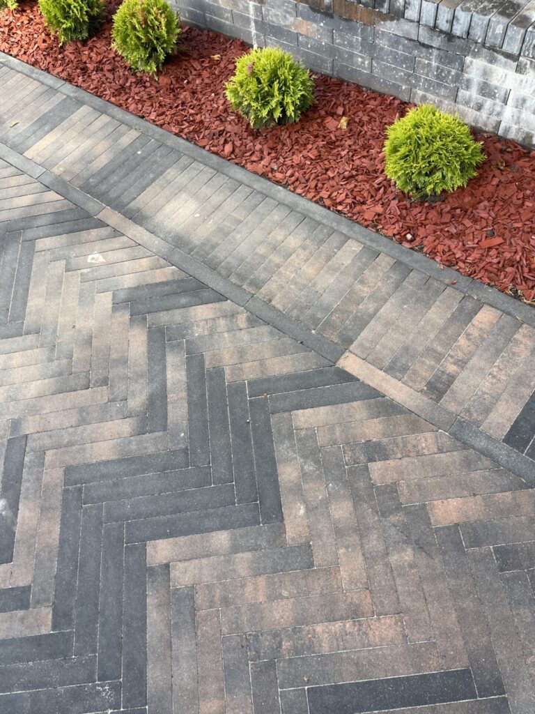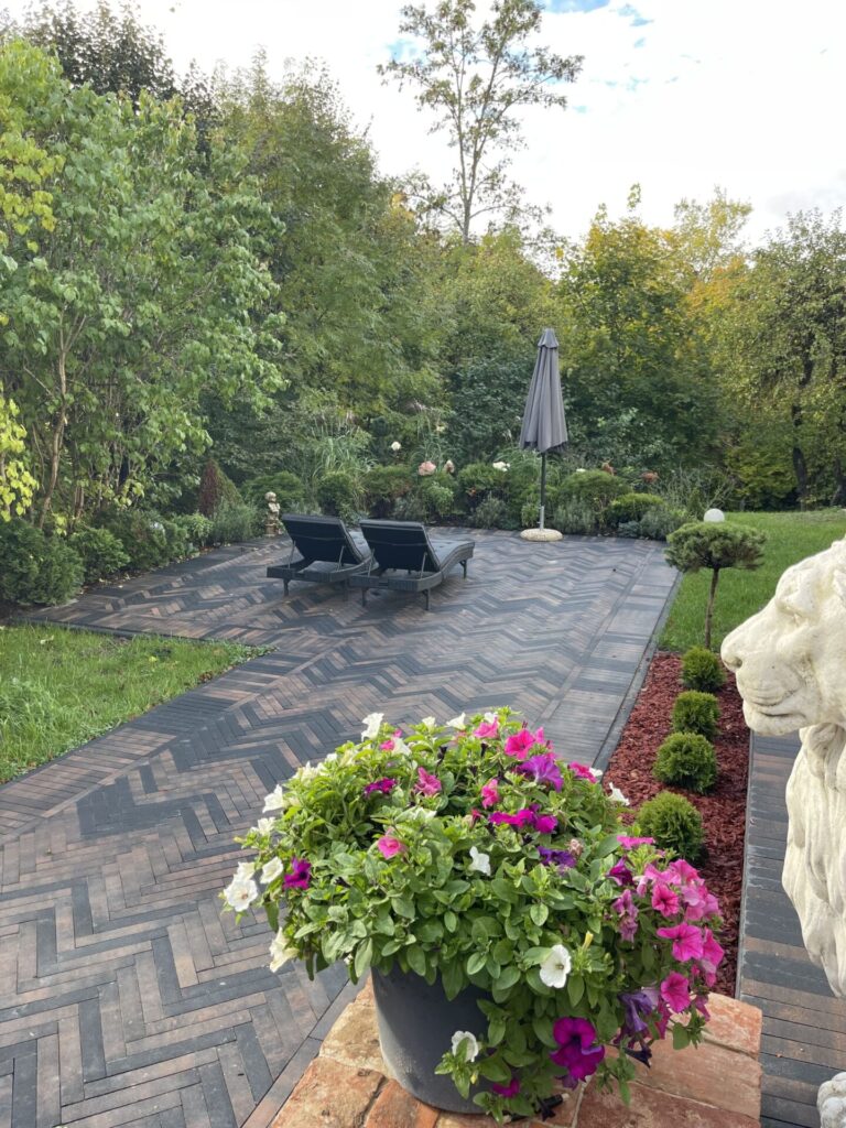 Pagalmā ieklāts Brikers Barons 360 Comfort Copper bruģis kombinācijā ar Kerbstone 8 Black apmalēm, kas lieliski pielāgojas ēkas arhitektūrai un apkārtējās vides noskaņai.